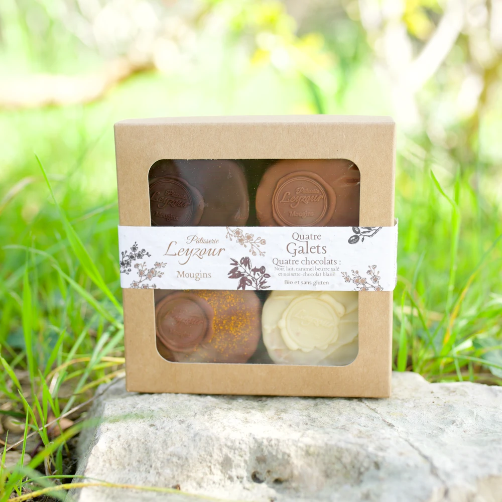 Click and collect uniquementCoffret de 4 galets gourmands : praliné & chocolat noir, gianduja & chocolat blanc, caramel au beurre salé, et chocolat noir. Composés d’ingrédients locaux et équitables. Emballage biodégradable, fenêtrée en cellulose de bois, avec bandeau ensemencé à fleurs sauvages, pour une expérience à la fois délicieuse et respectueuse de l’environnement.